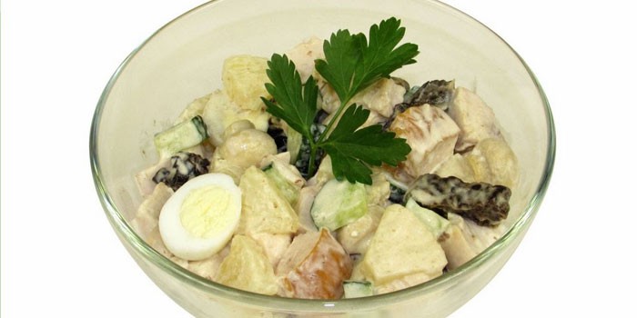 Всі компоненти в страві, приготованому за наступним рецептом, прекрасно гармонують. Салат з копченої курки з грибами готується з додаванням червоної консервованої квасолі і маринованої цибулі. Він виходить дуже ситним. За рецептом на закуску кладуть печериці, але ви нічого не зіпсуєте, якщо замінити їх на інші мариновані гриби, наприклад, опеньки.