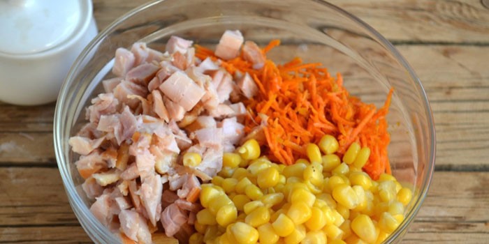 Якщо ви плануєте зробити смачну закуску, витративши при цьому мінімум часу і зусиль, обов’язково запам’ятайте наступний рецепт. Щоб приготувати салат з копченої курки і кукурудзи, знадобляться лічені хвилини. Це рятувальний круг на той випадок, якщо гості вже практично стоять на вашому порозі. У салатику дуже приємний солодкуватий присмак, які надають консервована кукурузки і морква.