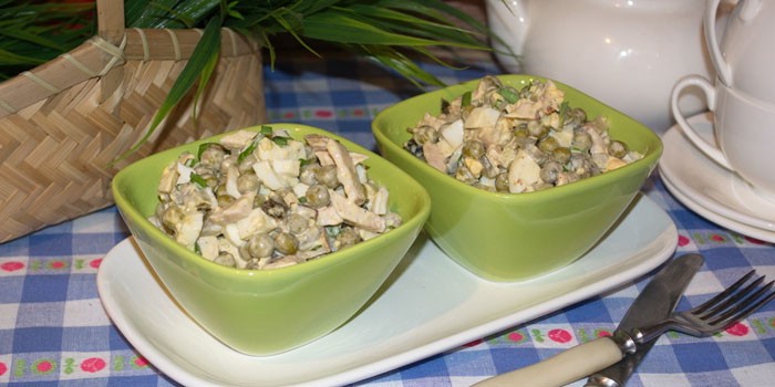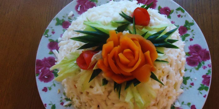 Ця чудова закуска отримала свою назву не випадково. На столі вона виділяється серед інших страв так само, як і наречена на весіллі, привертаючи до себе увагу всіх гостей. Ви можете переконатися в цьому, поглянувши на фото, на якому зображено це ласощі. Салат Наречена з копченою грудкою неймовірно смачний і ніжний. Деякі господині додають у нього буряк, але тоді інші продукти фарбуються і він виглядає вже зовсім інакше.