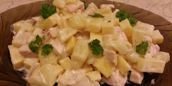 Закуска, приготовлена за таким рецептом, виходить дуже незвичайною, тому що в неї додається корінь селери. Салат з копченої курки з ананасами з-за цього інгредієнта набуває пряний смак. Не можна забувати, що корінь селери дуже корисний, багатий різними вітамінами. У цій закусці його будуть із задоволенням навіть ті люди, які перш даний продукт не жалували.