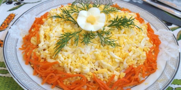 Гострим смаком і пряним ароматом володіє салат з корейською морквою і копченою куркою. У поєднанні з вареними яйцями, вершковим сиром виходить пікантний присмак, в якому добре відчуваються всі межі. Корейську моркву можна купити в магазині, але краще приготувати її самостійно, щоб отримати більш оригінальний смак, приправити спеціями за бажанням.