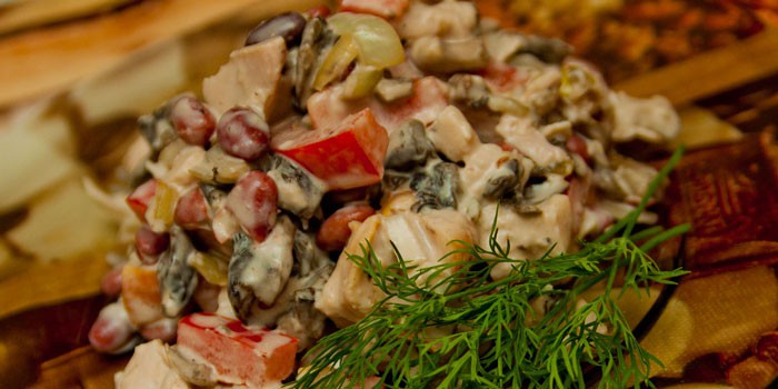 Неймовірно легким за зовнішнім виглядом і ситним виявиться салат з копченою куркою і квасолею. Останній компонент легко варіювати, виходячи з переваг. Можна брати домашню відварену квасолю, купити консервованої у власному соку або томатної пасти, білу або червону. Насичений смак, аромат димку і поєднання овочів нагадає про літніх пікніках. При бажанні можна додати китайську капусту.