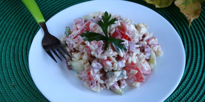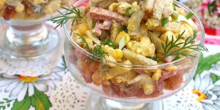 Салат з копченою ковбасою і кукурудзою