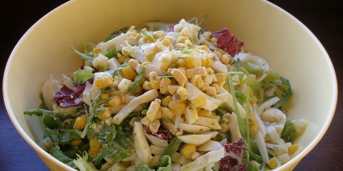 Ще одним простим варіантом стане рецепт, подсказывающий, як приготувати салат з кукурудзи з овочами. Підійде все, що ви виростили на власному городі чи купили на ринку – томати, свіжі або солоні огірки, морква, цибуля, пекінська капуста, редиска, стебла селери. Компоненти потрібно лише змішати, приправити майонезним соусом (або інший заправкою). Можна експериментувати: додати моркву по-корейськи, зелений горошок або просто варену картоплю..