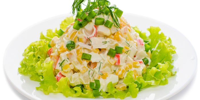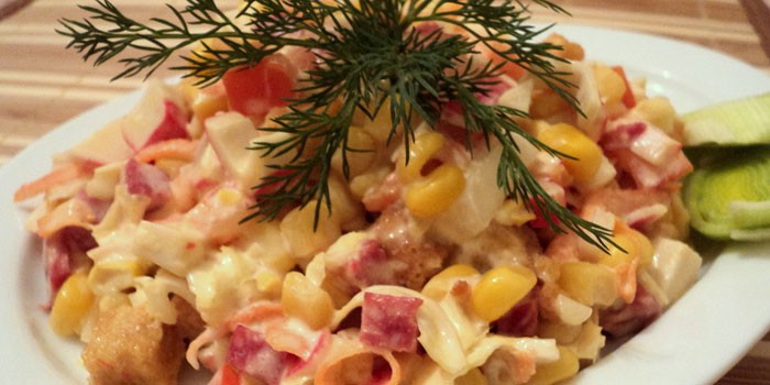 Ще з дитинства знайомий кожному крабовий салат з консервованою кукурудзою. Цю страву готували наші батьки на святковий стіл, день народження або Новий рік. Сьогодні можна вдосконалити смак закуски, замість звичних крабових паличок взяти крабове м’ясо, додати ананаси, свіжі огірки або пекінську капусту.