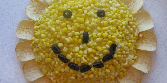 Гарним святковим блюдом є салат з курки і кукурудзи, зроблений у вигляді соняшника. У ньому зернышкам відведена головна роль – імітація жовтої серединки квітки. Виходить ефектне блюдо, яке по достоїнству оцінять всі прийшли на свято гості. Його приємно їсти, насолоджуватися тонким смаком, тонким ароматом і гарною подачею.