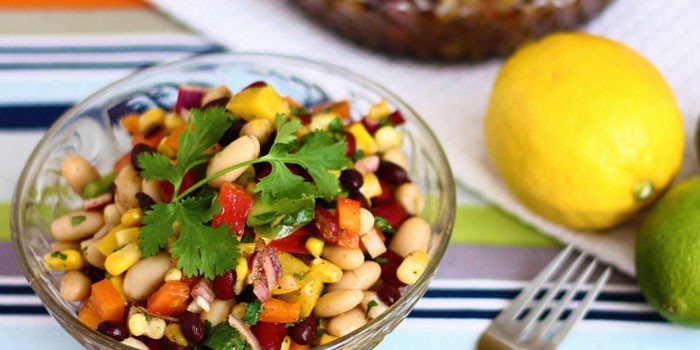 Дуже простим у виконанні буде салат з квасолею і кукурудзою консервованої, оскільки обидва продукту вже готові, їх потрібно тільки відкинути на друшляк і змішати. Підійде будь-яка квасоля – червона, біла, в томатному соусі або власному соку. Пікантності закуски надає незвичайна заправка з соку лайма і спецій. Таке блюдо добре їсти на свіжому повітрі – подавати його до шашликів, ковбаски гриль, печеного на вугіллі картоплі.