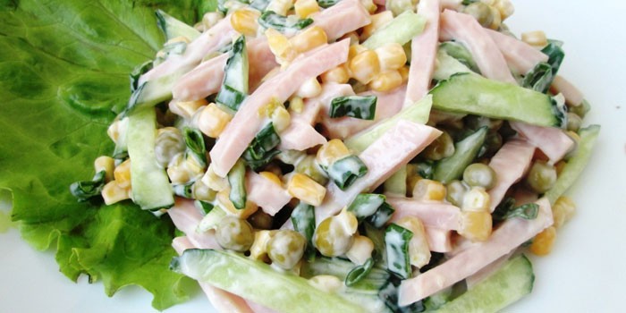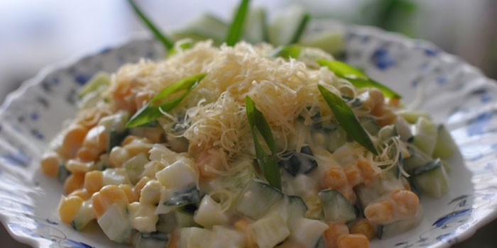 Не менш приємним освіжаючим весняним смаком відрізняється салат з кукурудзою і огірком, який надає всій закуски нові нотки літньої прохолоди. Щоб страва залишилося соковитим, але не дуже водянистим, огірки краще не очищати від шкірки, однак з’їсти такий салатик потрібно буде відразу ж. Невелика кількість твердого сиру додасть страві особливий м’який смак, вершковий аромат і ситність.