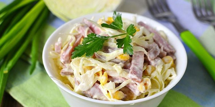 Тих, хто шукає варіант дієтичного страви, виручить інструкція, як приготувати салат з капусти та кукурудзи. Якщо замінити шинку вареним курячим філе, то можна отримати блюдо зі зниженою калорійністю, а якщо вибрати пікантну копчену грудинку або стегенце, вдасться приготувати більш ситний варіант салату з консервованою кукурудзою