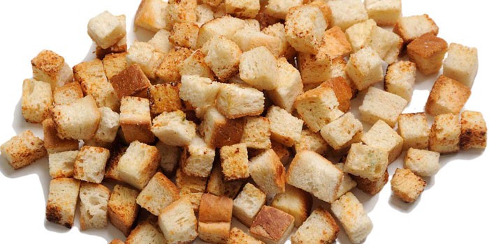 - Для закуски з сухариками підійдуть як домашній, підсушений в духовці, хліб, так і готові магазинні Кириешки. Останні можна придбати з будь-яким смаком, але особливо яскраво на тлі інших інгредієнтів будуть виділятися сухарі з часниковим смаком, беконом або сметаною.