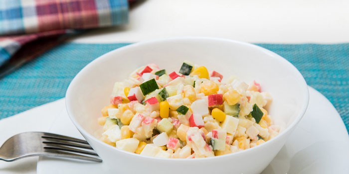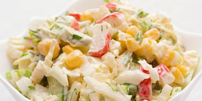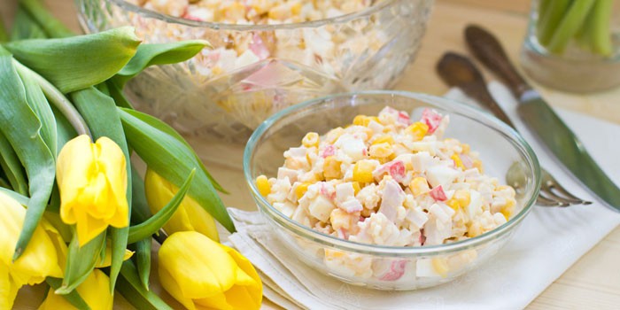Варіантів приготування крабового салату налічується велика кількість. Хто-то робить його з додаванням кислих яблук, інші воліють замінити крабове м’ясо курячим філе, іншим подобається традиційна подача. У будь-якому випадку, одноманітність рано чи пізно набридає, а господині починають пошук нових рецептів з фото. Спробуйте приготувати пікантний кукурудзяний салат за такого варіанту.