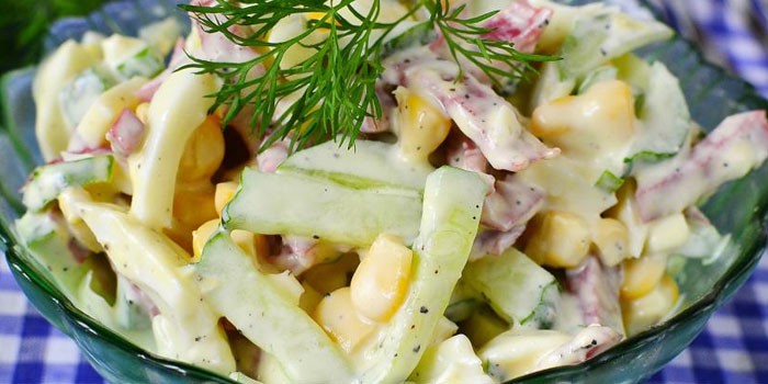 Що найімовірніше знайдеться в холодильнику у кожного жителя нашої країни? Правильно: яйця і ковбаса. Якщо ж до цих двох інгредієнтів додати ще баночку кукурудзи і цибулю, то вийде смачна закуска до обіду або ланчу. Заправити таке блюдо ви можете на свій розсуд: оливковим маслом, кефіром, вершками або сметаною. Головне – не боятися експериментів на кухні.