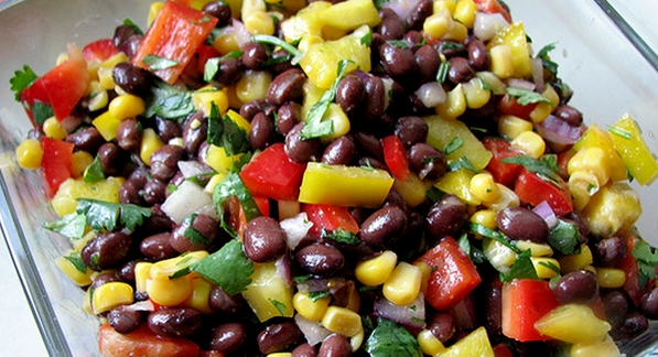 Попередньо зливаємо з баночок квасолі і кукурудзи рідина. Ретельно перемішуємо квасолю, нарізану киндзу, кукурудзу, нарізану авокадо, шматочки помідорів і болгарського перцю, сіль і розмелений перець. Додаємо суміш оливкової олії з соком лайма і видавленим часником.