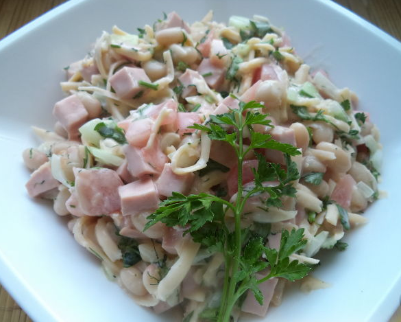 Нарізаємо кубиками два очищених яблука без серцевини, триста грам сиру, шинку. Змішуємо з квасолею в кількості 250 грам, майонезом або йогуртом і для смаку додаємо цукор і сіль, видавлений зубчик часнику.
