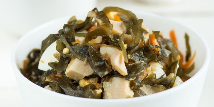 Такі пікантні і свіжі поєднання продуктів відмінно працюють з м’ясом, допомагаючи його засвоєнню, і добре проявляють себе у відношенні фігури, оскільки розганяють обмінні процеси. Швидкий і легкий салат з морської капусти та яєць може бути приготований на кожен день, але вигідно виглядає на святковому столі. Якщо ламінарія не консервована, додайте до списку продуктів трохи яблучного оцту і меленого чорного перцю, щоб замаринувати цибулину і водорості для пікантного смаку. При проблемах зі шлунком цього робити не варто, а сам цибулю доведеться потримати в окропі.