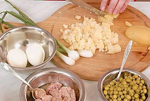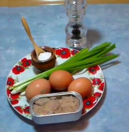 Яйця зварити круто, очистити і натерти на тертку. Якщо використовується твердий сир, його також натерти. Цибулю нарізати в довільній формі. Печінку потрібно викласти разом з маслом (якщо використовуєте масло з консерви) в тарілку, розім’яти виделкою. Якщо використовується вершкове масло – спочатку потрібно злити масло з консерви, а потім розім’яти печінку.