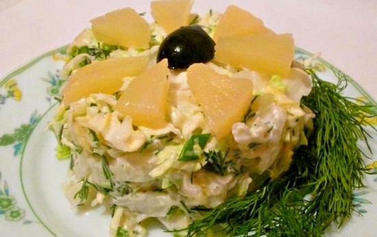1. Ймовірно вам дуже до вподоби припадають салати, в які входить мінімум елементів композиції. Цей рецепт як раз з виду простих, але неймовірно смачних салатів. Як заправку, ми з вами використовуємо нежирну сметану або майонез. Всього 15 хвилин у вас займе це чудове блюдо! Вашій увазі належить салат з пекінською капустою, ананасом і куркою.