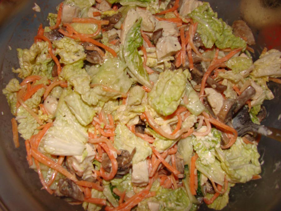 Дуже свіжий салат з пекінською капустою і печерицями виходить, якщо дотримуватися запропоновані пропорції. Свіжі овочі чудово поєднуються з грибами, а курячі яйця, дрібно порізані, обволікають своєю ніжністю кожен продукт. Олію можна вибрати по своєму смаку, а я люблю використовувати для заправки майонез. Для невеликої пікантності можна зробити масляну заправку з додаванням часнику – це порушить смакові рецептори.