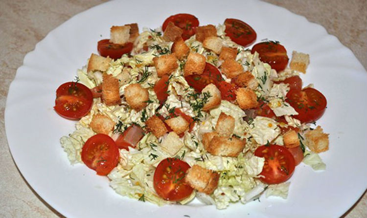 Крутонами називають сухарики, які робляться самостійно і додаються в якості повноцінного компонента, а не хліба. Вони помітно прикрашають салат і додають нові відтінки смаку, завдяки спеціям, які добре вбирають під час смаження.