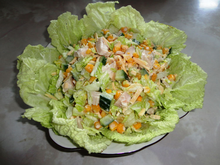 Ніжна, делікатна і соковите м’ясо курочки ніколи не стане зайвим у черговому салаті. Тим більше, якщо салат капуста, кукурудза, огірок буде заправлений натуральним йогуртом. Адже це явна ознака того, що всі гості будуть просити добавки!