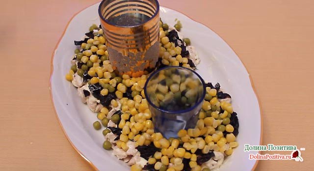 Другим “поверхом” відправляємо чорнослив. Потім горошок з кукурудзою. Четвертий шар — гриби. П’ятий — морква. Коли практично всі верстви будуть викладені, підправляємо нашу форму, підрівнюємо бортики.