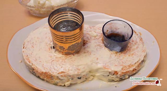 Підготувавши всі компоненти, займемося оформленням блюдця для салату. На плоску тарілку ставимо дві склянки різного діаметра — для формування вісімки.