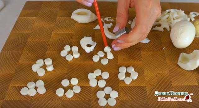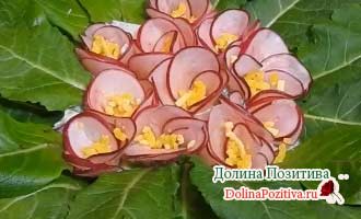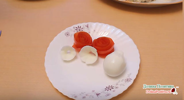 Приступаємо до підготовки елементів декору. Беремо томат і починаємо зрізати шкірку по колу. У підсумку вийде довга стрічка”, шириною 1-1,5 див Просто згортаємо її. Так і отримуємо трояндочку. Робимо 5 квіточок з помідор і стільки ж з білків. З яєць виходять ромашки. Зрізаємо широку “стрічку” по колу яйця. Зріз робимо хвилеподібний. Потім з’єднуємо кінці, отримуючи таку “чарочку”, яка і буде імітувати ромашку.