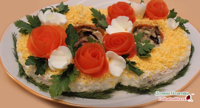Прикрашаємо блюдо квіточками, гілочками кропу і петрушки. Оформлення можете взяти запропоноване, а можете пофантазувати самі. З внутрішнім вмістом ж точно не помилитеся.