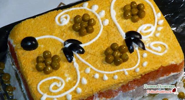 Оформляємо салат зеленим горошком і візерунком з майонезу, який наноситься за допомогою кондитерського мішка.