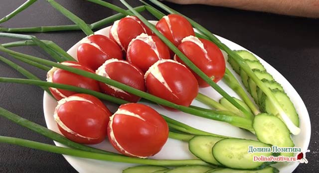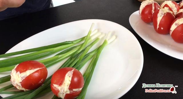 На плоске блюдце викладаємо пір’я цибулі — вони підуть в якості стеблинок. Поверх відправляємо томати, які виступають в ролі бутонів. Завершуємо оформлення тонкими огірковим кружальцями, які розкладаємо по низу зображення.