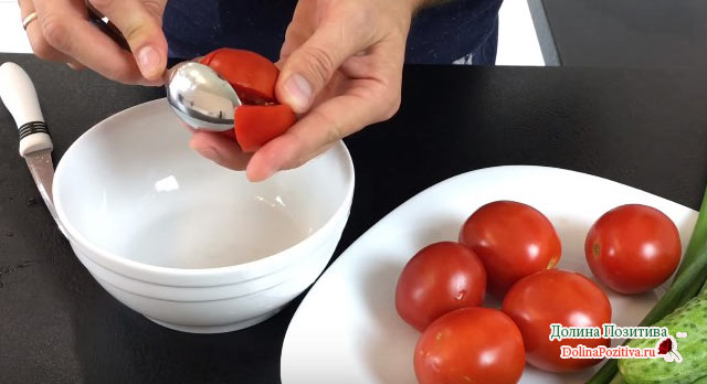 У першу чергу займемося помідорами. Надрізаємо плоди хрест-навхрест, видаляємо всю м’якоть з допомогою чайної ложки.