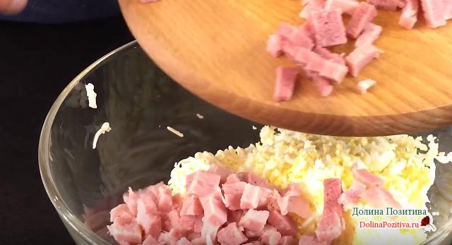 Сирки і яйця натираємо на середній тертці. Дрібненько шаткуємо шинку і часник. Зубчики з’єднуємо з майонезом. Огірок ділимо тонкими кільцями і відставляємо в сторону. Плоди знадобляться пізніше, для декору.