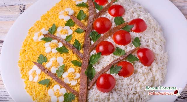 Ситний і смачний салат з незвичайним оформленням. Яскраве і красиве дерево дарує весняний настрій. Звідси і назва страви.