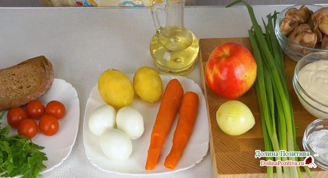 Всі підготовлені компоненти, приступаємо до складання салату. Викладатися він буде на плоску тарілку шарами: картопля, зелений лук, печінка, смажена цибуля, яблука, моркву. Печінку з золотистою цибулею можна змішати і відправити в один шар. Поливаємо кожен рівень (крім печінки з цибулею) майонезній сіточкою. За бажанням підсолюємо.