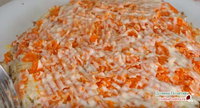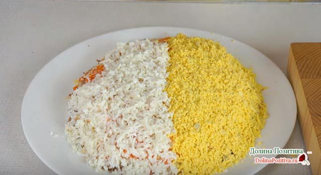 Білки, що залишилися натираємо на дрібній тертці і покриваємо морквяний шар і бортики салату. Зверху рівномірно розподіляємо натерті жовтки.