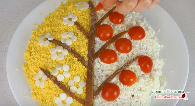 Залишки білка і жовтки подрібнюємо на дрібній тертці окремо. Половину поверхні салату заповнюємо рівномірно білками, іншу половину — жовтками (трошки залишаємо для декору). Зрізаємо шкірку біля хлібних шматочків — для стовбура і гілок дерева. Черрі ділимо половинками.