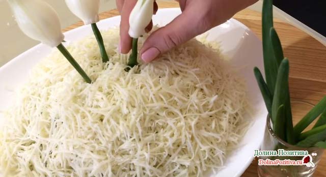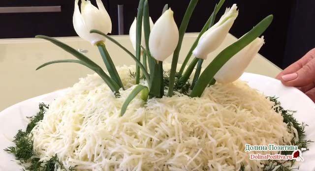 Викладаємо салатну масу гіркою на плоску поверхню, посипаємо тертою моцарелою і прикрашаємо пролісками з ріпчастої і зеленої цибулі.