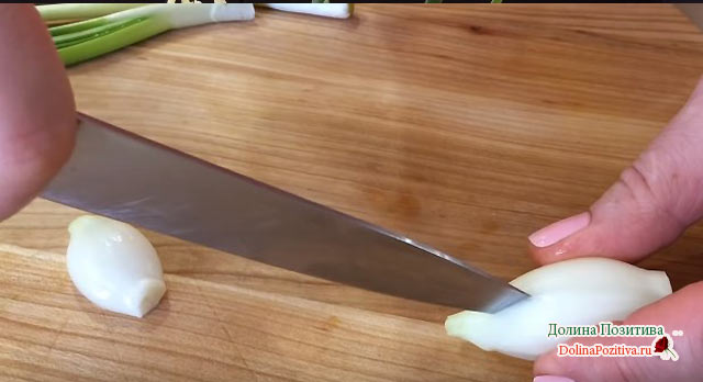 В першу чергу приступимо до оформлення салату. Очищаємо цибулини, знімаємо кілька шарів. Беремо частину, робимо кілька вертикальних надрізів по колу головки і відправляємо “бутон” в холодну воду. Даємо йому розкритися.
