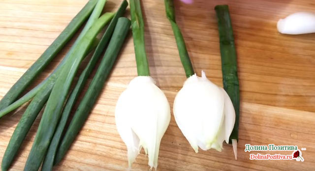 Обрізаємо зелений лук, підлаштовуючи пір’я під висоту шпажок. Нанизуємо цибулю на дерев’яні палички. Вийдуть стійкі стеблинки для пролісків. З’єднуємо їх з розкритими бутонами. Відставляємо проліски поки в сторону.