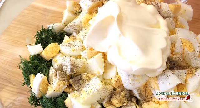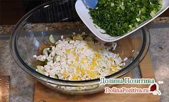 Займемося самим салатом. Зелену цибулю і кріп дрібно шаткуємо. Трохи кропу залишаємо на оформлення. Огірки і яйця ділимо кубиками. Моцарелу натираємо на дрібній тертці. З’єднуємо всі компоненти (крім сиру), перчимо, поливаємо майонезом, перемішуємо.