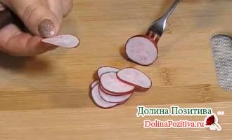 Рада! Редис дуже незручно нарізати, особливо тонкими слайсами. Велика ймовірність пошкодити пальці, так як плід нестійкий і постійно крутиться. Введіть біля основи редиски вилку. В процесі нарізки утримуйте овоч з допомогою столового приладу: і пальці захищені, і редис нікуди не покотиться.