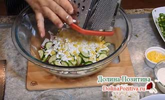 З’єднуємо овочі в одній ємності. Яйця натираємо на крупній тертці. Один жовток пропускаємо через дрібну тертку і залишаємо для декору. Відправляємо терті яйця в загальну масу.