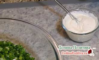 Готуємо заправку. З’єднуємо 1 до 1 сметану і майонез. Рекомендується брати домашній майонез. Вводимо в масу гірчицю, перець і доводимо до однорідності.