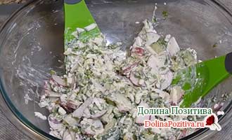 Заправляємо салат, пробуємо на смак. За необхідності підсолюємо. Потім перекладаємо масу в салатницю, відправляємо в холодильник і приступаємо до оформлення.