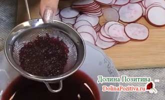 Редиску, що залишили для декору, нарізаємо тонкими кружечками. Чим тонше, тим краще. Столову ложку тертого буряка перекладаємо в ситечко і опускаємо в глибоку тарілку з водою і сіллю (½ ч. л.) — отримуємо буряковий сік. Опускаємо в лілову рідина кільця редиски на 5 хвилин. Так вони змінять колір.