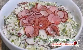 Зібраний салат підправляємо виделкою, надаємо акуратну форму і приступаємо до оформлення. Нарізаємо білок пластинами, товщиною 3 мм