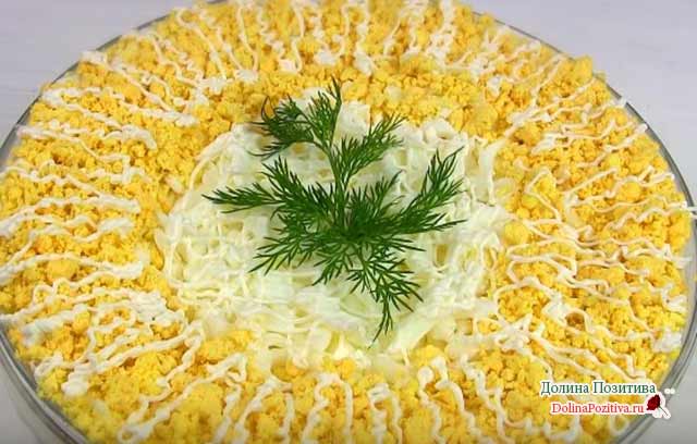 10. Варені яйця розділити на білки і жовтки. Білки перетріть через крупну тертку, жовтки розкришите виделкою. Поверх сиру розподіліть білковий шар, по краю посипте жовткову крихту. Верх листкового салату прикрасьте майонезній сіточкою, центр позначте яскравою зеленою гілочкою свіжого кропу.