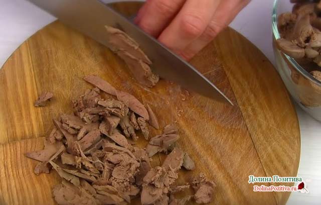 1. Ретельно вимийте курячу печінку, видалите судини і плівочки. Покладіть в холодну воду, додайте трохи солі, пару лаврових листів, кілька горошин запашного і чорного перцю. Доведіть до кипіння, зніміть пінку і варіть на невеликому вогні протягом 20 хвилин. Готову печінку промийте в проточній воді. Наріжте соломкою або тонкими пластинками. При використанні яловичої печінки допустимо подрібнювати її на крупній тертці.