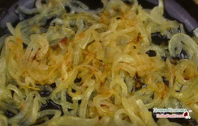 2. Цибулини наріжте на тонкі півкільця. Обсмажуйте на рослинному маслі, поки не набудуть золотисту скориночку.