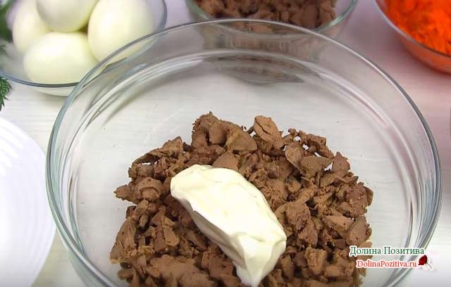 5. На дно салатника викладіть половину подрібненої печінки. Змастіть парою столових ложок майонезу.